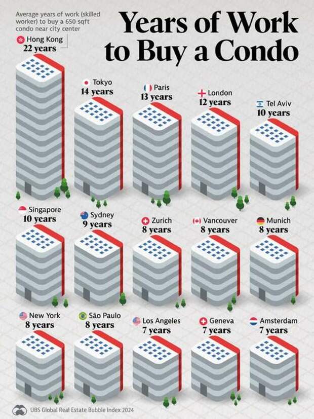 This graphic, via Visual Capitalist, shows the average number of years that a skilled worker must work in order to afford a 650 square foot condo near the city center across select markets, based on data from the UBS Global Real Estate Bubble Index 2024.