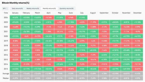 As Tom Mitchelhill reports, the price of Bitcoin historically averaged a slump of 0.35% in June, according to data from Coinglass, which tracks the monthly returns of Bitcoin beginning in 2013.