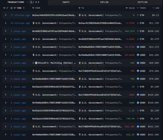 According to Arkham intelligence data, the U.S. government has made large transactions, specifically the address holding funds seized from Estonian crypto entrepreneurs Sergei Potapenko and Ivan Turogin.