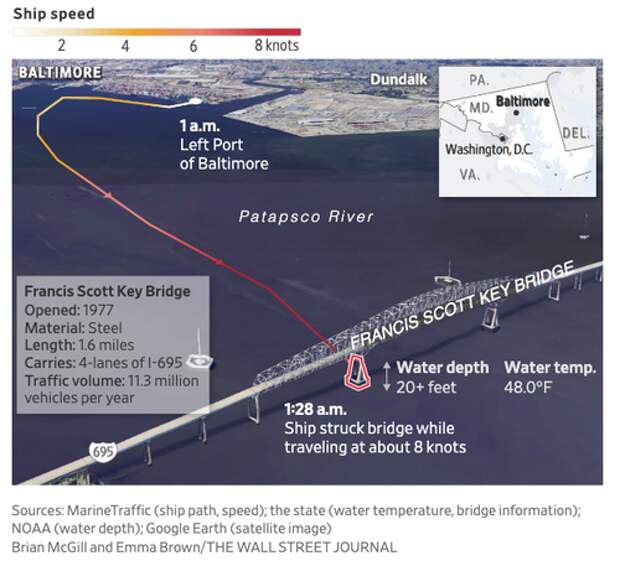According to a Coast Guard briefing report viewed by the WSJ, Dali's lights began to flicker about an hour after the ship began steaming down the marine channel out of the Baltimore Inner Harbor.