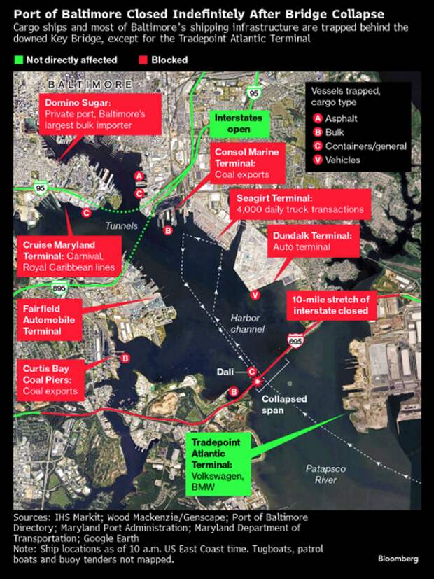 - The wreckage from the Francis Scott Key Bridge essentially blocks incoming and outgoing traffic to the Port of Baltimore.