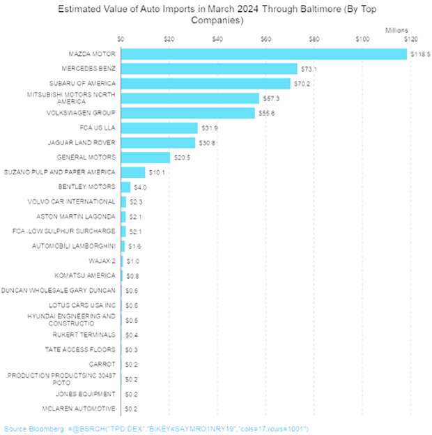 According to S&P Global Market Intelligence, the Port of Baltimore handled about 3% of all East Coast and Gulf Coast imports in the year through Jan. 31. It's a crucial terminal for European carmakers such as Mercedes-Benz Group AG, Volkswagen AG, and BMW.