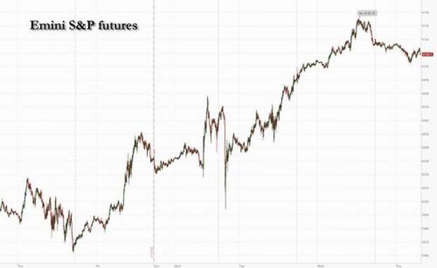 US equity futures are slightly lower as markets look to take a breather after making a new intraday all-time high in the US and Europe on Wednesday. As of 7:30am, S&P futures dipped 0.1% after the index closed on the brink of record peak, propelled by optimism over - what else - artificial intelligence, and a solid batch of earnings from corporate heavyweights.