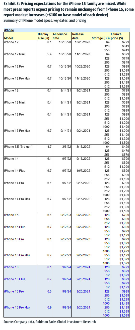 Press reports regarding price increases are mixed, with Techradar expecting prices to increase +$100 across all four models, with the base and Plus starting at $899 (v. $799 prior) and $999 (v. $899 prior), and Pro and Pro Max models at $1,099 (v. $999 prior) and $1,299 (v. $1,199 prior), respectively, while Forbes expects prices to remain unchanged from the iPhone 15 family of phones. However, similar to its 2023 price increase on the base model of the iPhone 15 Pro Max, where it raised entry prices by $100 ($1,099 to $1,199) by eliminating the 128 GB storage option, AAPL could possibly raise entry prices on the iPhone 16/Plus/Pro models by eliminating the 128 GB entry-level storage option. We note that the iPhone Pro has not seen a price increase since it was first introduced with the iPhone 11 Pro in September 2019. In our view, AAPL's investments in iPhone hardware and across the Apple ecosystem (e.g., software, services) in recent years have provided consumers with additional value and should help warrant the price increases.