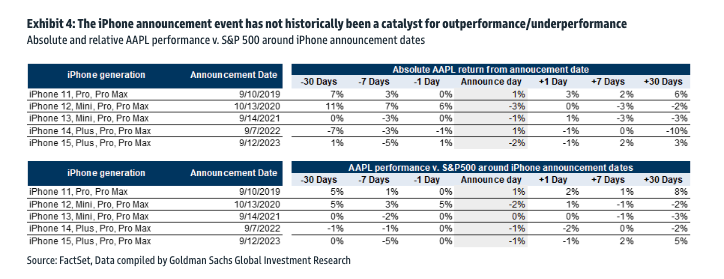The analysts pointed out that new iPhone debuts have not historically been a catalyst for outperformance or underperformance in the stock.