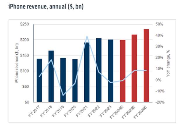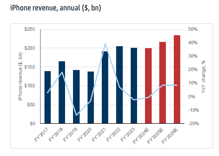 "Although we forecast iPhone revenue to decline 1% yoy in F2024, iPhone revenue should grow 9% yoy in F2025 and F2026," they said.