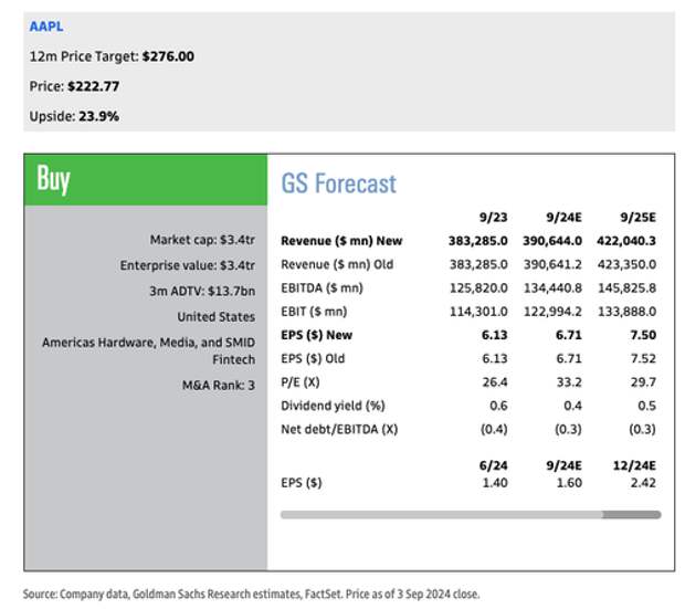 Goldman analysts have a 'Buy' rating on Apple and a 12-month target price of $276 ($275 prior), reflecting 33X (unchanged) from their NTM+1Y EPS.