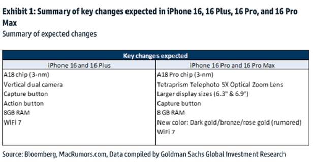 Modest form factor changes are expected, per Bloomberg. Press expectations for hardware updates include (1) display size increases for the iPhone Pro (6.3" v. 6.1" 15 Pro) and Pro Max (6.9" v. 6.7" 15 Pro Max); (2) the introduction of A18 chip series made with 3nm process which improves speed and power efficiency (3-nm chips previously only featured within the iPhone 15 Pro and Pro Max with A17 Pro chips); (3) the expansion of the Action button to all iPhone 16 models (v. 15 Pro/Pro Max only prior); and (4) improved camera features, with vertical lenses on 16/16 Plus models and a "Capture" button.