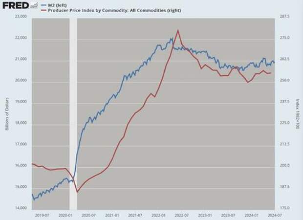 Still, by and large, and over the long term, the price level reflects the money stock. The last four years have provided a near-perfect demonstration of that fact. We can see it by overlaying M2 (the most accurate measure of the stock of money we have) with the price of commodities purchased by producers (which are unchanged in quality and not subjected to crazy adjustment schemes). The result shows the direct relationship: prices respond to the expanded money stock with a time lag.