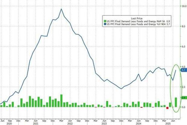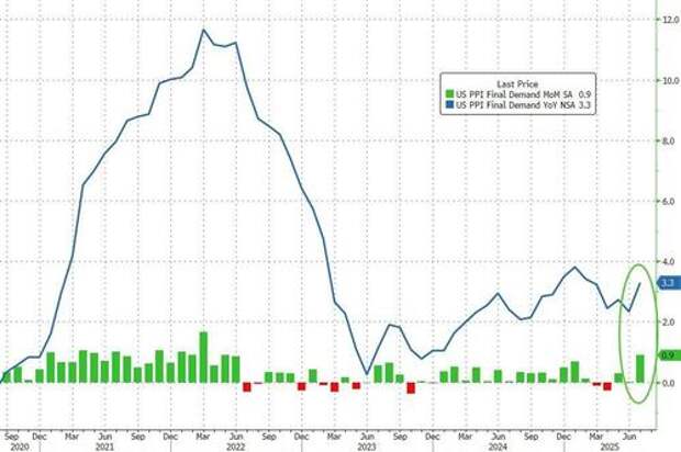 ...and accelerate it did - dramatically with headline PPI rising 0. 9% MoM (massively more than the +0.2% expected and the biggest jump since June 2022) sending PPI up 3.3% YoY (highest since Feb 2025)...