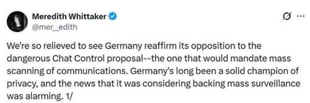 The president of messaging app Signal, Meredith Whittaker, said on Thursday that while Germany’s opposition to the measure is a relief, she warns that “the war is not over,” because it now moves to “the European Council, where the issue is unresolved.”