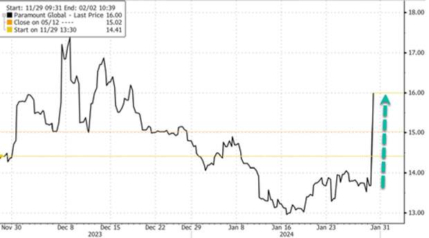 Around 0700 ET, Paramount's non-voting shares jumped 17% and soared as high as 22% earlier this morning. If the gains hold into the cash session, this would be the largest intraday move for the stock since March 2020.