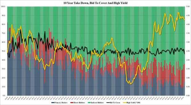 The bid to cover dropped bigly, from 2.611 to 2.351, the lowest since August 2024, and clearly well below the six-auction average of 2.58.
