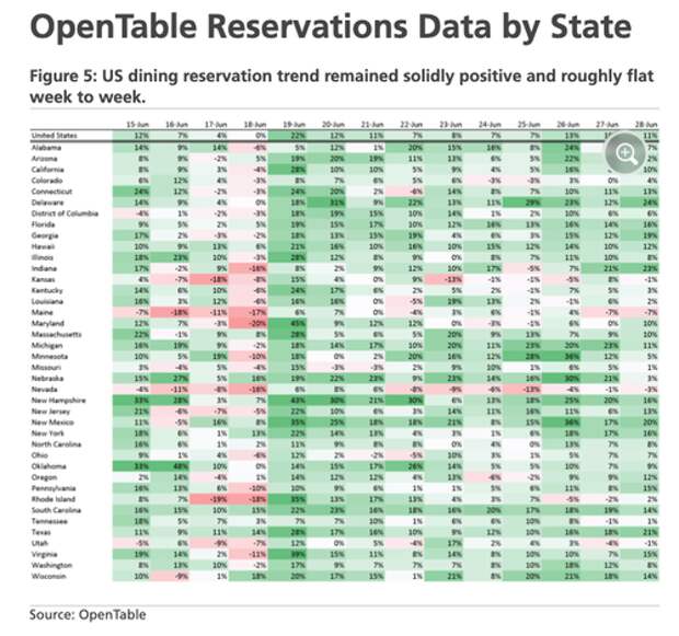 Restaurant reservation platform OpenTable shows postive trends across the industry on a state-by-state basis. This is a proxy for real-time restaurant traffic trends.