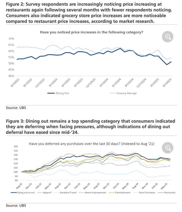 According to recent consumer survey data, consumer confidence has encouragingly improved slightly among lower income households, while the improvement is more noticeable among middle income consumers. Additionally, although dining out remains a top spending category that consumers indicated they are deferring when under financial pressure, indications of dining out deferral continued to eased in the June survey (see Charts of the Week inside). That said, consumers are concerned about the impact of tariffs, with 90% of respondents noting concern in a recent Numerator survey (in line w/ earlier results), and 81% expecting to adjust their finances or shopping habits in response. But consumers are less worried about the impact tariffs could have on the overall economy, w/ 33% worried about the impact (from 41% in late April).