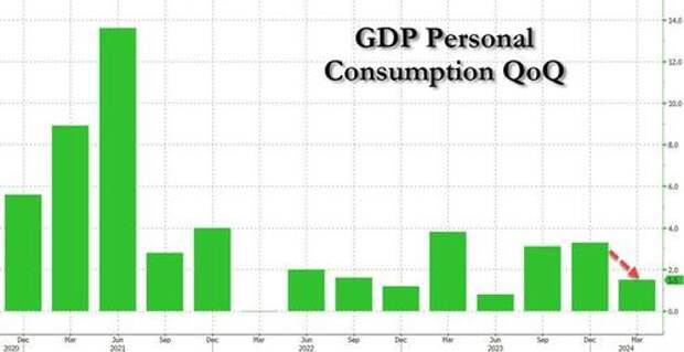 - Personal consumption was responsible for 0.98% of the bottom line 1.41% GDP growth, a big drop from the 1.34% in the second estimate and almost half the 1.68% consumption in the first estimate!