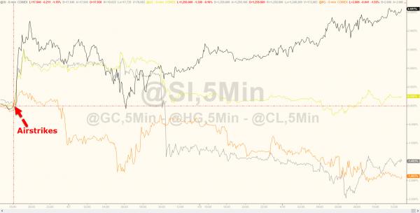 Gold is holding positive post-Airstrikes and crude is surging as copper fades...
