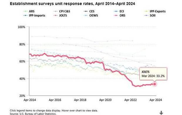 Finally, no matter what the "data" shows, let's not forget that it is all just estimated, and it is safe to say that the real number of job openings remains still far lower since half of it - or some 70% to be specific - is guesswork. As the BLS itself admits, while the response rate to most of its various labor (and other) surveys has collapsed in recent years, nothing is as bad as the JOLTS report where the actual response rate remains near a record low 33%