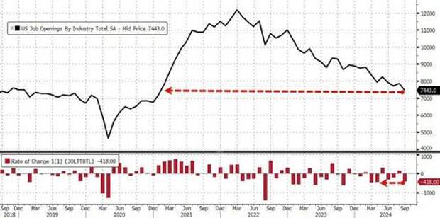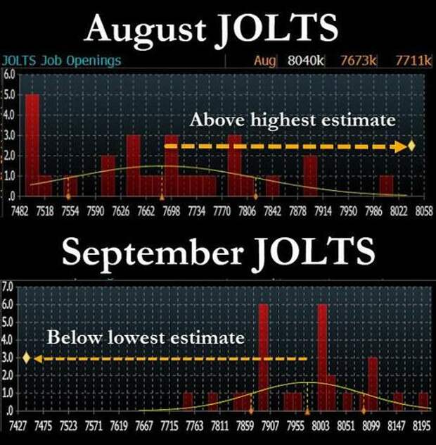 7 million to 8.040 million, which was not only a 3-sigma beat to expectations, but was also above the highest Wall Street forecast. Fast forward to today, when Kamala's chance of winning are effectively zero - as even the suddenly apolitical Jeff Bezos now admits - and shockingly moments ago the BLS reported that in September, the number of job openings plunged from over 8 million to just 7.4 million, the lowest since early 2021...... a staggering 6 sigma miss to expectations, and a number which came below the lowest estimate; in fact as shown below, in just one month we have gone from a staggering beat to one of the biggest misses on record!