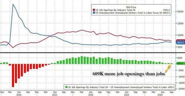 Setting the glaring data manipulation aside, in the context of the broader jobs report, in September the number of job openings was 690K more than the number of unemployed workers, slightly down from the previous month and not too far from inverting once again, similar to what happened during the covid crash.