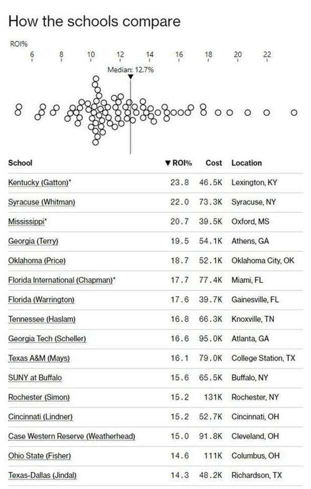 Bloomberg did their own ROI analysis and found the University of Kentucky’s Gatton College of Business and Economics offers the best ROI among the schools listed, with an impressive annualized ROI of 23.8%. This is largely due to its relatively low cost of $46,500 and its accelerated 11-month program, which allows students to re-enter the workforce more quickly. Located in Lexington, KY, Gatton provides an exceptional return on investment, making it a standout choice for prospective MBA students looking to maximize their financial outcomes.