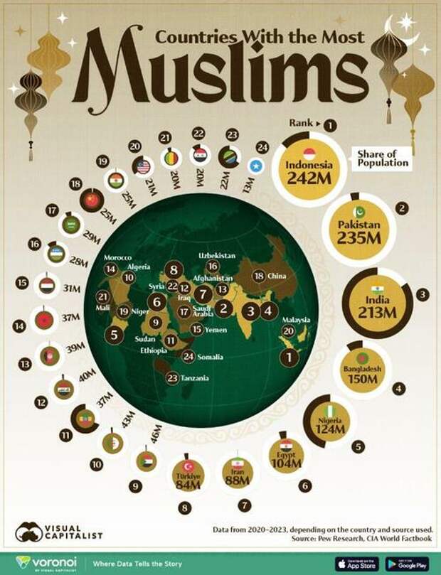 Indonesia (242 million), Pakistan (235 million), India (213 million), and Bangladesh (150 million) alone account for nearly 40% of the world’s Muslims.