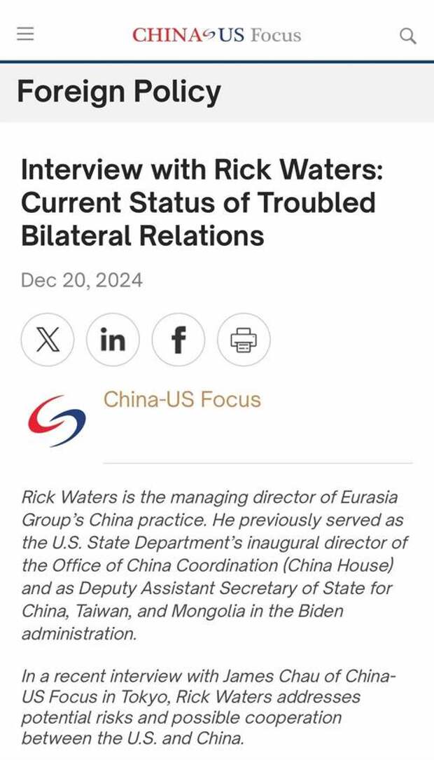 In late 2024, Waters participated in an official interview for China–US Focus, a platform run by the China–United States Exchange Foundation (CUSEF). In the interview, he called for “restraint” and “dialogue,” insisting that “both sides must avoid confrontation.” The phrasing matched Beijing’s diplomatic line word for word.