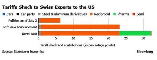 According to Bloomberg Economics, if the 39% tariff rate came into effect across the board - especially on pharmaceuticals - that would put up to 1% of Switzerland’s economic output at risk over the medium term.