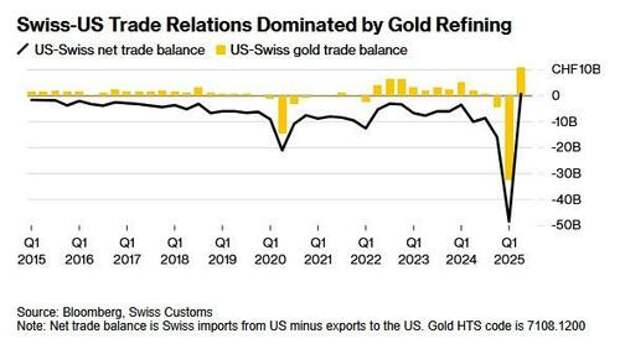 - Trump’s aides claim that Switzerland’s out-sized trade deficit with the US is why the president imposed such high levies. On average, two thirds of last year’s $38 billion deficit was due to shipments of bullion. That’s because of the price of the metal itself rather than any added value by Swiss refineries, which largely focus on resizing bars. “Gold is special,” said Simon J. Evenett of IMD Business School in Lausanne. “It isn’t really manufactured in Switzerland. Processed is a better word.”