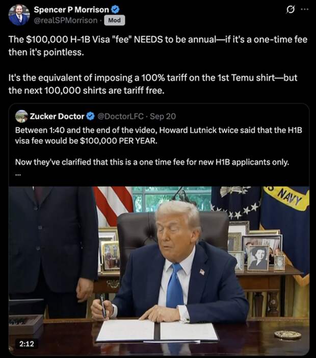 Morrison, by contrast, insists the $100K H-1B “fee” is far too weak to protect American labor and was ticked off by Trump/Lutnick’s reversal from it being an annual fee to one-time: