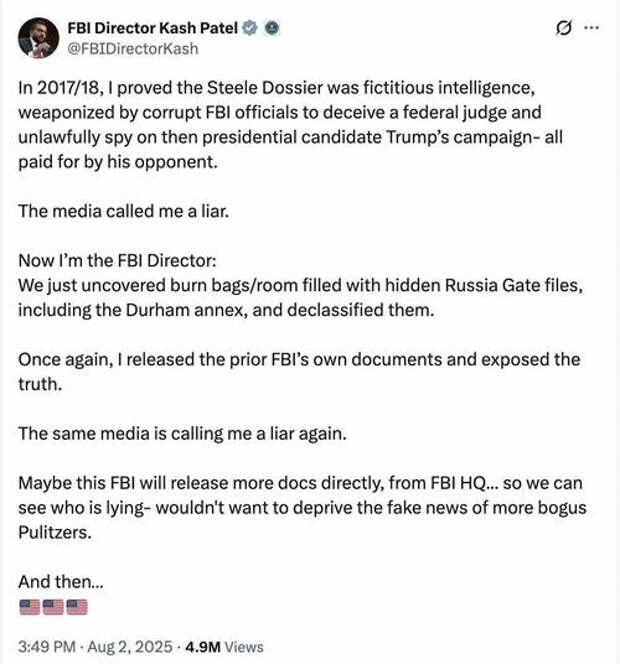 Witness FBI Director Kash Patel throwing down a gauntlet this weekend, right after your piece ran. He challenged media figures who called him a “liar” in 2018, when as an investigator in the House Permanent Select Committee on Intelligence (HPSCI) chaired by California’s Devin Nunes, he outed the Steele Dossier as “fictitious intelligence” used to deceive a federal judge and unlawfully spy on Trump’s campaign.