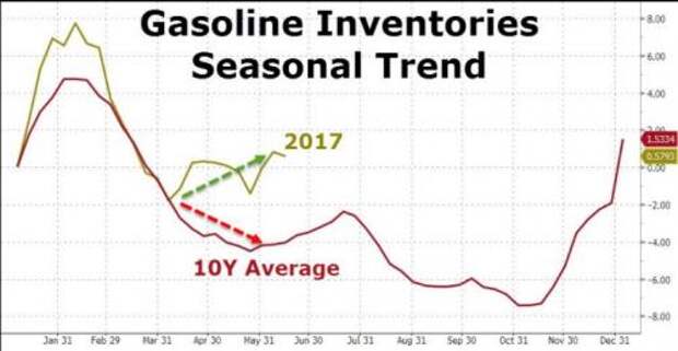 While the cause of the supply is obvious, whatever has caused demand to fall off is less clear. Barclays has suggested that President Donald Trump's immigrant crackdown has made millions of illegal immigrants living in the US afraid to get behind the wheel for fear of being detained and deported. If this is true, that means Trump is to thank for gasoline prices falling to their lowest levels since February, despite the start of the summer driving season?