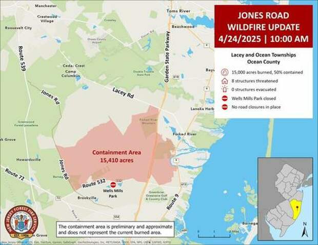 The latest New Jersey Forest Fire Service update indicates that the wildfire is 50% contained.