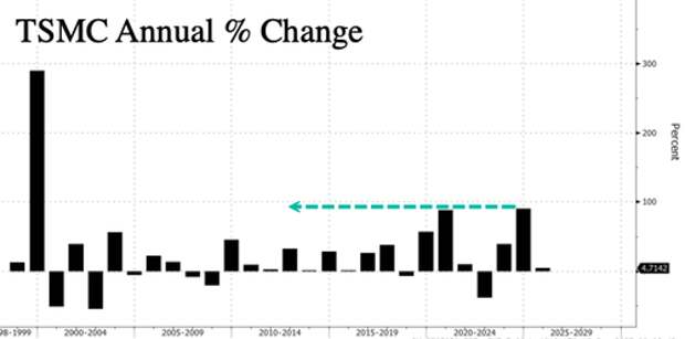 In 2024, TSMC shares in New York jumped nearly 90%, the largest annual percentage gain since the Dot Com frenzy of 1999.