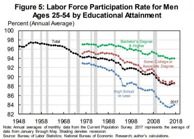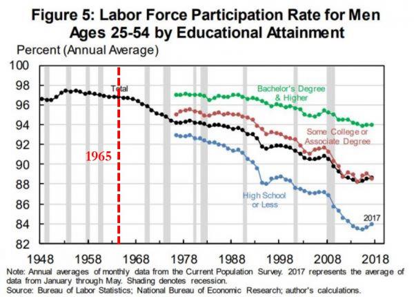 Esteemed Princeton professor and former Obama White House economist Alan Krueger is back with yet another prediction about why Americans, particularly men between the ages of 25-54, suddenly no longer have any interest in working. In his report, entitled "Where Have All The Workers Gone? An Inquiry Into The Decline Of The U. S. Labor Force Participation Rate," Krueger ponders the data below which reveal that the labor force participation rate among men, aged 25-54, started dropping around 1965 and has been steadily declining ever since.