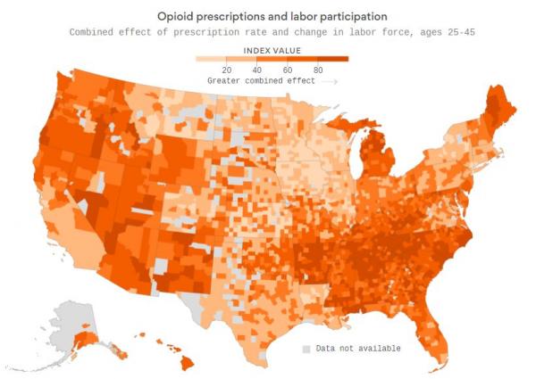 In “Where have all the workers gone? An inquiry into the decline of the U.S. labor force participation rate” (PDF), Princeton University’s Alan Krueger examines the labor force implications of the opioid epidemic on a local and national level.