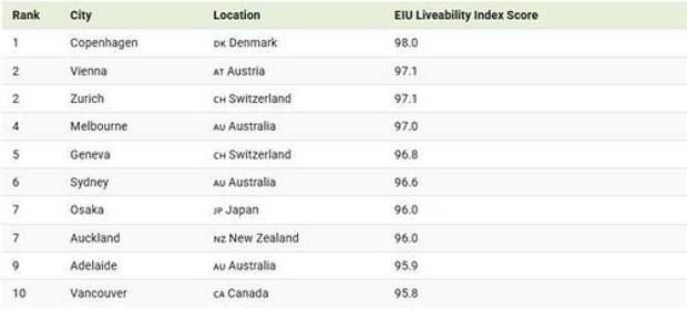 Below, we show the 10 most livable cities in the world according to The Economist, and their livability scores.