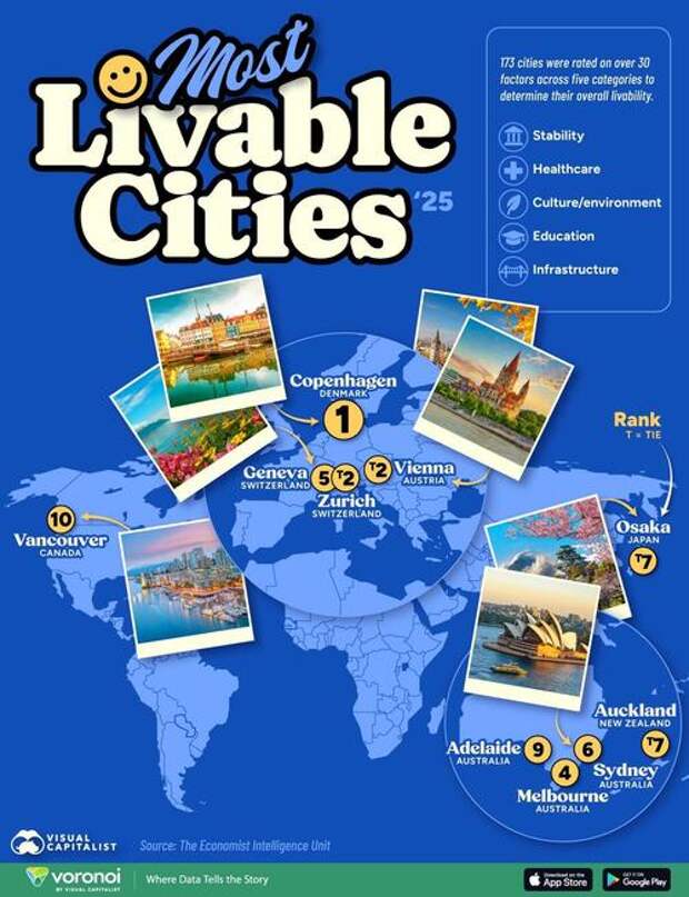 This map, via Visual Capitalist's Kayla Zhu, shows the 10 most livable cities in the world, according to The Economist Intelligence Unit’s Global Liveability Index 2025.