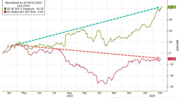 Wall Street is still piling into Goldman's GLP-1 Obesity drug basket to capitalize on slimming down Americans while trimming companies with potential downstream risks related to obesity drugs, as indicated by the Goldman Sachs Global HLC GLP Risk index.