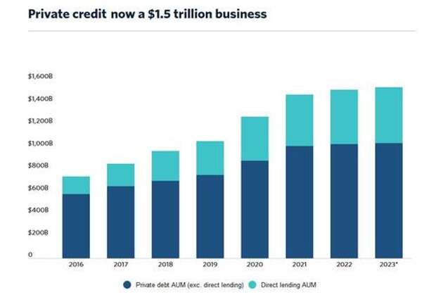 Lenders in the private markets range from funds deploying direct lending strategies to investment vehicles such as business development companies (BDCs) and collateralized loan obligations (CLOs) as well as insurers and pension funds, among others. According to PitchBook data, the assets under management (AUM) of global direct lending funds alone have quintupled, surpassing US$550 billion by 2023, up from US$95 billion ten years ago; the total private universe AUM is now $1.5 trillion.