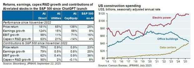 I think this is well understood, but just to reinforce the point: AI related stocks (1) have accounted for 75% of S&P 500 returns, 80% of earnings growth and 90% of capital spending growth since ChatGPT launched in November 2022. AI is showing up other places as well. Data centers are eclipsing office construction spending and are coming under increased scrutiny for their impact on power grids and rising electricity prices.