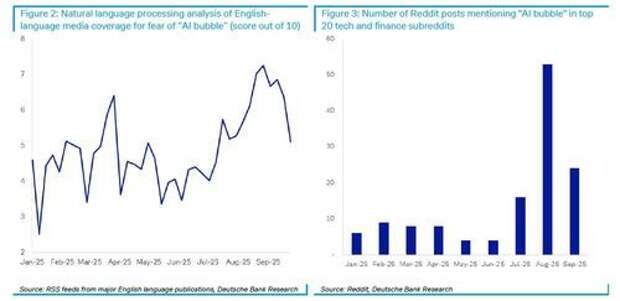 DB confirmed this with an AI-assisted natural language analysis of English language publications since the start of the year. AI-related investment concerns in technology articles reached a high point of 7.3 on a 10-point scale in the last week of August and have since subsided to 5.1. (The previous high of 6.4 was around the US Liberation Day tariffs in March.) DB's analysis of technology and finance Reddit posts mentioning an “AI bubble” showed the same trend.