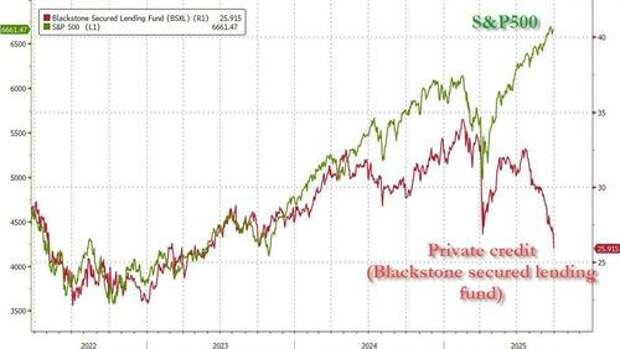 It is here that we encounter the first not so small problem: while one can pretend that equity growth is infinite, at least for the AI equity universe which as Cembalest above noted has contributed 75% of all S&P500 market cap gains since Nov 2022, when it comes to the fundamental analysis that at least some have done on the private credit backing these castles in the sky, things are turning very, very ugly: presenting exhibit A: the stock price of Blackstone's Private Credit BDC, i.e. the Blackstone Secured Lending Fund: today, BXSL just hit a 2025 low taking out the April Liberation Day bottom and is at the lowest level in over two years, having massively diverged with the S&P.