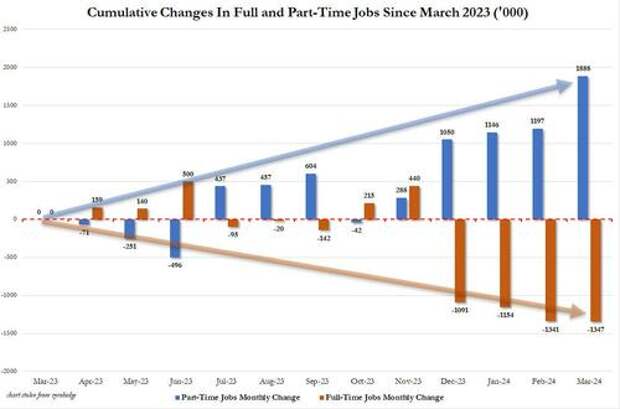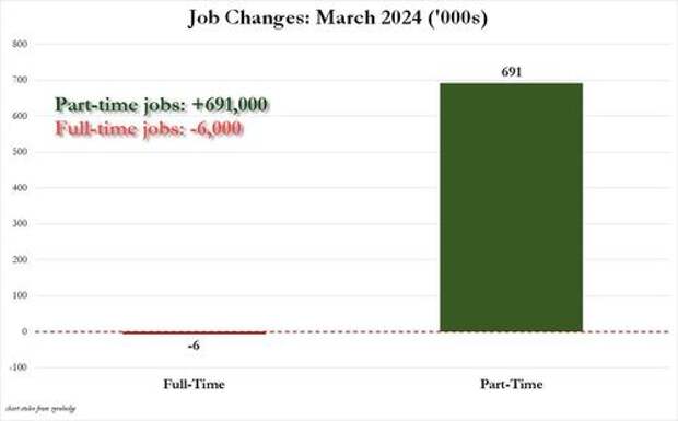 Here is exhibit A: in March, the number of part-time jobs soared by 691K to 28.632 million, up from 27.941 million while full-time jobs dropped by 6,000, to 132.940 million from 132.946 million.