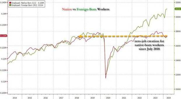Regular readers are aware that all the job gains since 2018 have gone to immigrants, mostly illegal immigrants, something we spent last month's jobs post discussing in detail.