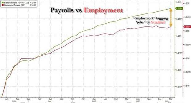 Still, despite the modest rebound in employment, it still lags payrolls by almost 9 million jobs since the covid trough.