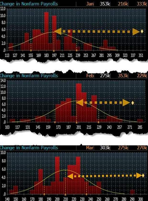 To be sure, superficially the March report was another artificially goalseeked blowout that guaranteed it would have zero credibility: with 303K payrolls added which was a 4 sigma beat to the median estimate of 214K and above the highest Wall Street forecast. There is just one problem: the number of multiple-sigma beats in recent months has been so high, the entire concept of "beats" has become laughable.