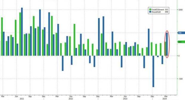 Consider this: January was a 5-sigma beat to expectations; February was a 3-sigma beat and March, we just learned, beat the median estimate by 4-sigma. Not only that, but in every of the last 3 months, the actual payrolls number (at least before it was revised lower the next month), has come in higher than the highest Wall Street estimate! We kinda feel bad for Biden trying so hard to manipulate the economy and population into liking Bidenomics and approving of his disastrous economic policies. Maybe he should just report one month that jobs rose by 10,000,000 and sit back and wait for his approval rating to hit 100... or something.