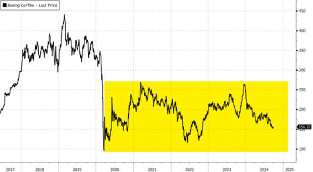In markets, Boeing shares in New York are down 40% on the year (as of Friday's close). Since peaking at $440 a share in 2019 (around the Max crashes), shares are 65% off the high, oscillating between $250 and $100 since the early 2020 crash.