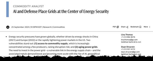 As they put it: "The grid is a vulnerable link in energy security.""The need to invest in the power grid – a vulnerable link in the energy supply chain – and the associated metals demand boost are becoming more acute with the rise of AI, geopolitical tensions, and the shift to hybrid warfare," analysts Lina Thomas and Daan Struyven wrote in a note to clients on Thursday titled "AI and Defense Place Grids at the Center of Energy Security."